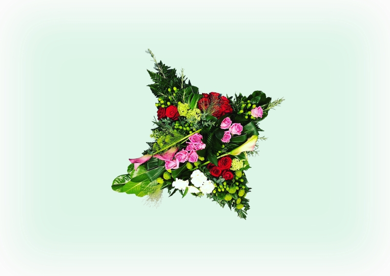 This arrangement is based on a 17" pad, in pinks, reds and greens with roses, chrysanthemums and calla lilies. Colours and flowers may be changed by you or the florist. Prices may vary depending on availability and size required.